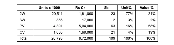 The value share of type of vehicles is quite different from the units share. Passenger vehicles accounted for the largest value share at 58% while 2 wheelers accounted for the largest volume share at 77%