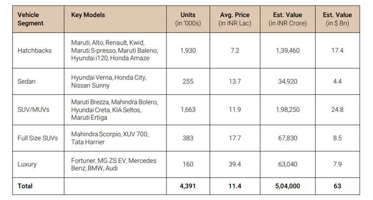 Passenger vehicles produced Rs 5 Lac crore value. The mid-size and full-size SUVs sub-segments accounted for over half of the value. The compact sub segment is also important and created 25% of value. The luxury vehicles contributed to Rs 63,000 crore in value, or 13% of the segment. People are not preferring the cheaper ‘Mini’ cars and Sedans and they have low share in value. The key manufacturers in this segment are Maruti, Hyundai, Tata, Mahindra, Kia, Toyota, VW and Honda.