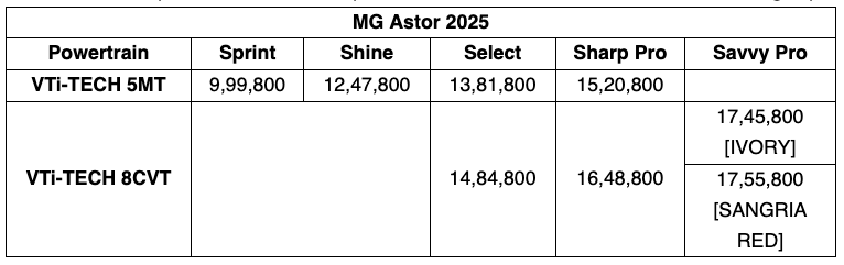 JSW MG Motor today launched the MY 2025 editions of India's Most Advanced SUV in its class - MG Astor, introducing new features for its Shine and Select variants. The Shine variant of Astor 2025 comes with a panoramic sunroof and six speakers, providing a pleasurable driving experience. This makes MG Astor the only SUV in its segment to offer a panoramic sunroof under INR 12.5 lakh. The Select variant further elevates comfort and safety with the addition of six airbags and premium ivory leatherette seats. India’s first SUV with AI inside will be available in the variants - Sprint, Shine, Select, Sharp Pro and Savvy Pro, starting at an attractive price of INR 9.99 Lakh ex-showroom price.